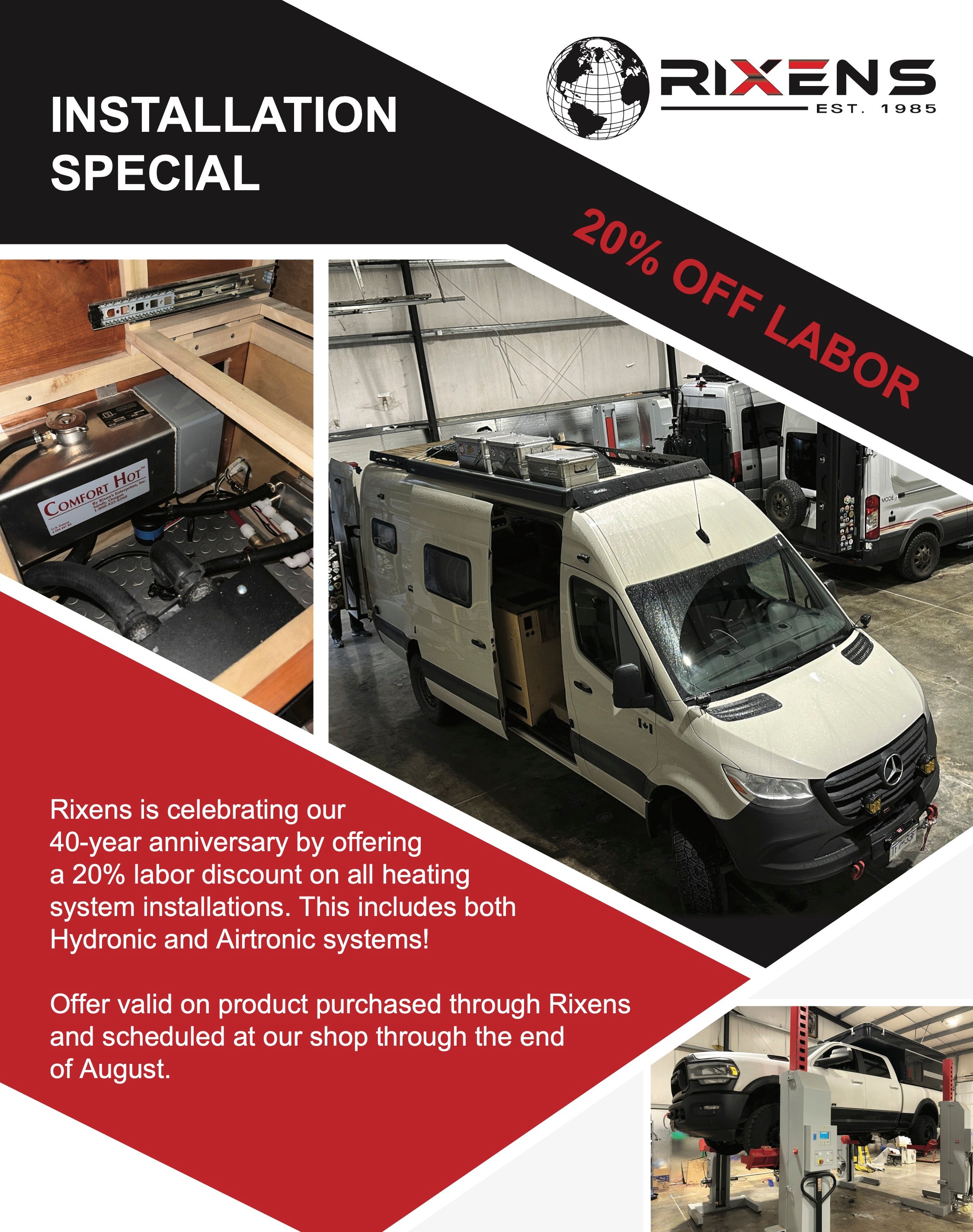 At Rixen’s Enterprises, we know how important it is to have your vessel or vehicle outfitted with functional and reliable amenities. We work with you to recommend and install the best custom system for your needs and are available to support our installed systems for the duration of their use. While our systems are flexible and usable for many applications, we find that customers are most commonly looking for system installations in Sprinter Vans, Class A, B, and C RVs, and boats of various sizes. Check out the corresponding pages below to see how Rixen’s Enterprises can bring you reliable comfort for your vessel or vehicle.